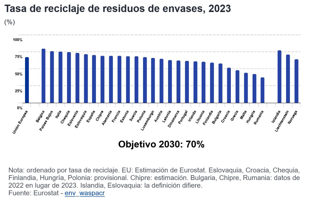 La tasa media de reciclaje de residuos de envases en la UE alcanzó el 67,5% en 2023, un incremento respecto a años anteriores y muy cerca del objetivo del 70% fijado por la Directiva 94/62/CE para 2030. Sin embargo, cada realidad nacional es desigual.