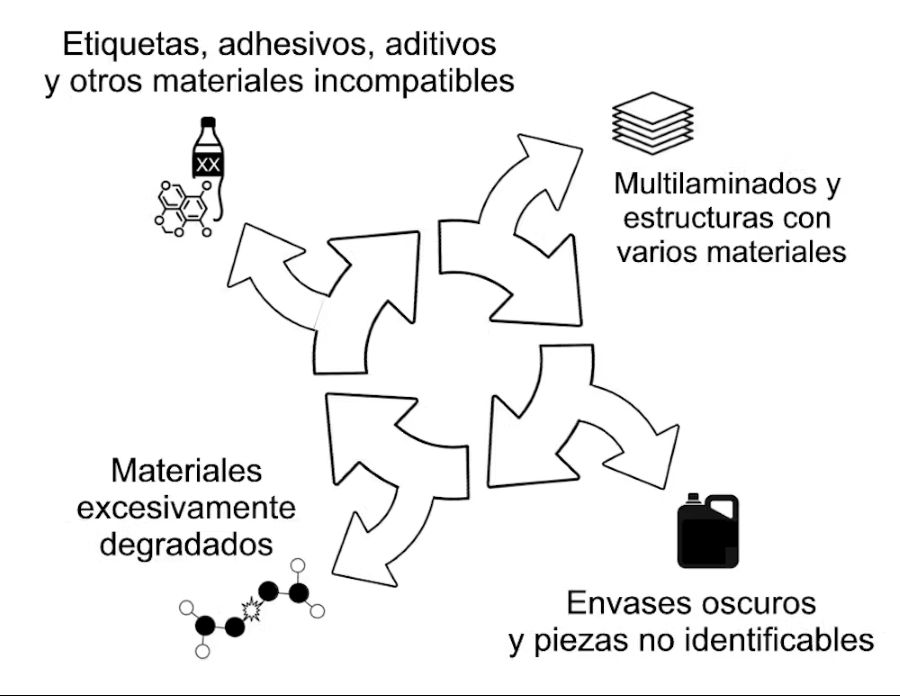 Las limitaciones técnicas se deben a que la mayoría de los productos están diseñados para ser funcionales, no para ser reciclados. El uso de materiales complejos, colores oscuros que los sensores no detectan o la presencia de etiquetas y adhesivos, provocan que una gran parte del material se descarte. Incluso en el que sí se recupera, la mezcla de resinas incompatibles impide volver a fabricar el mismo producto.