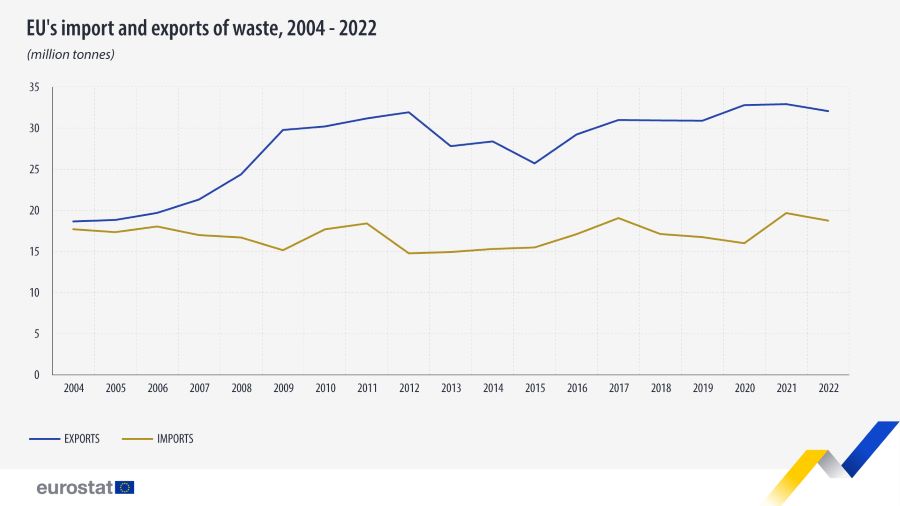 La Unión Europea (UE) exportó 32,1 millones de toneladas de residuos a terceros países en 2022. Esto supuso un ligero descenso del 3% en comparación con 2021. En cuanto a las importaciones de residuos procedentes de países no pertenecientes a la UE, disminuyeron un 5% desde 2021, sumando 18,7 millones de toneladas. Así lo reflejan los datos anuales sobre el comercio de residuos que ha publicado Eurostat.