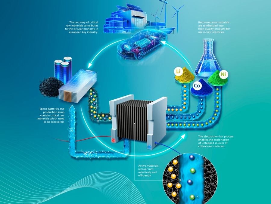 El proyecto MeGaBat, financiado por el Ministerio Federal de Investigación, Tecnología y Espacio de Alemania, se centra en el desarrollo de métodos para la extracción electroquímica de materiales activos de baterías. En este marco, los investigadores han diseñado un reactor electroquímico equipado con electrodos específicos capaces de captar de forma selectiva iones metálicos presentes en el agua de proceso.